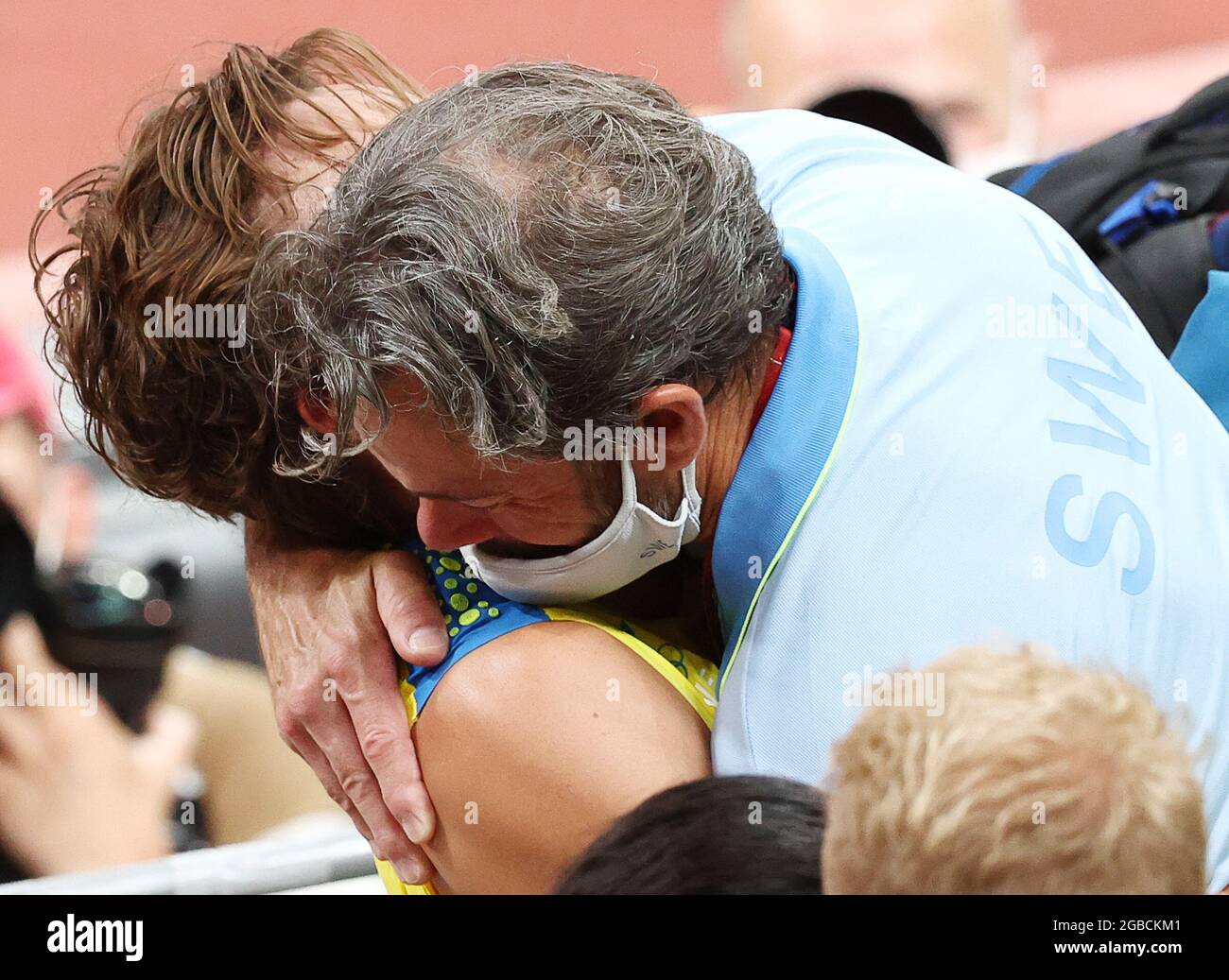 Tokio Japan 3 August 2021 Der Schwede Armand Duplantis L Feiert Mit Seinem Vater Und Trainer Greg Duplantis Nachdem Er Im Japan National Stadium Wahrend Der Olympischen Sommerspiele 2020 In Tokio